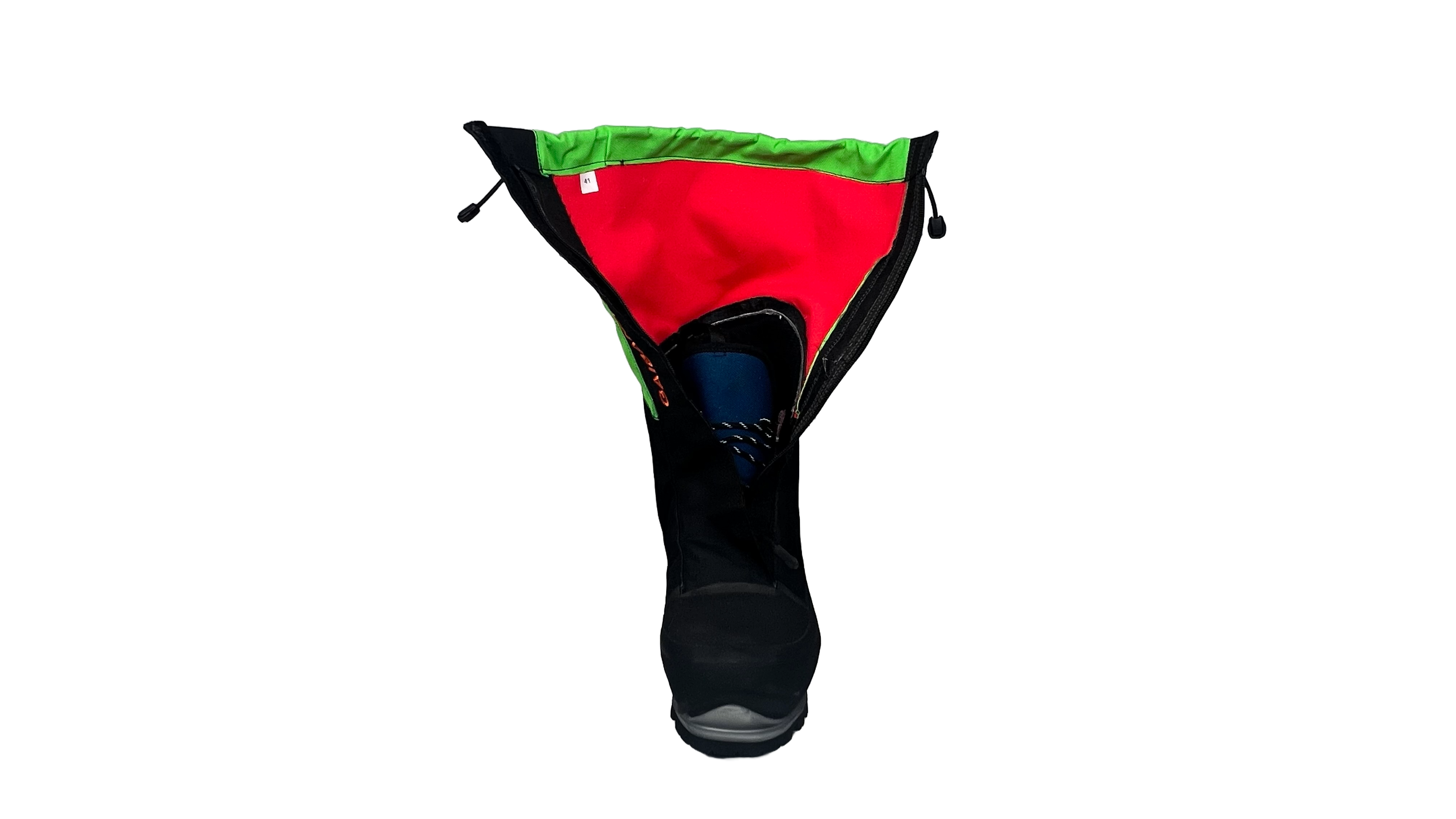• Parte superiore della ghetta in cordura idrorepellente con terminale in elastico, chiusura completa della ghetta con cerniera centrale gommata e protezione della cerniera con patella in cordura velcrata